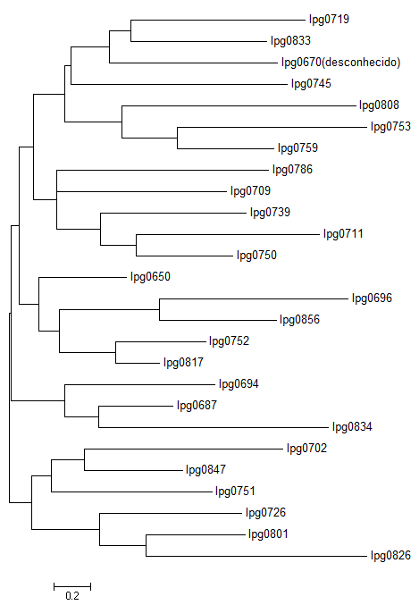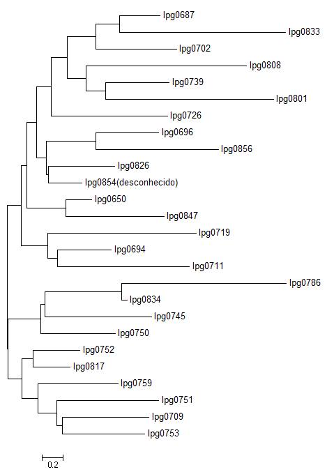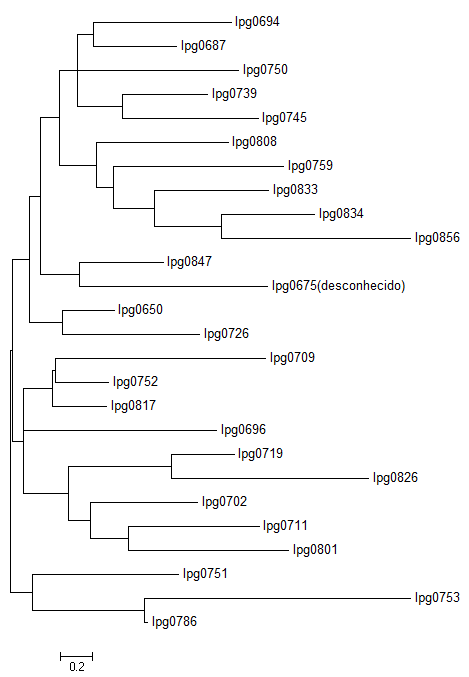 Uma vez que o genoma em estudo continha inúmeros genes sem função definida, procedeu-se à análise filogenética entre estes genes e um conjunto de genes homólogos. É de salientar que os genes com função definida foram obtidos através da base de dados SwissProt. Para a realização desta análise utilizou-se o software MEGA e obtiveram-se árvores filogénicas referentes aos genes de função desconhecida. Quanto maior a proximidade filogénica maior a probabilidade de os genes comparados partilharem a mesma função. Primeiramente foram convertidos para versão FASTA os genes de função conhecida e os genes de função desconhecida, recolhidos através da base de dados do NCBI. Uma vez que para a zona do genoma estudada muitos dos genes não tinham função definida apenas foram analisados 5 genes.